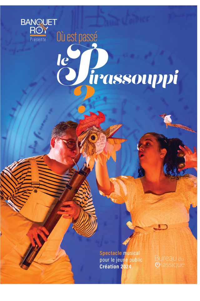 Deux musiciens découvrent une partition ancienne renfermant un mystérieux message caché. Il n’en faut pas plus pour éveiller leur curiosité et entraîner petits et grands dans une enquête musicale, à la recherche d’un drôle d’animal. Entre le conte musical et le théâtre d’objet, les deux artistes, multi-instrumentistes et chanteurs, entraînent les enfants dans un tourbillon de rencontres fantastiques. Viole de gambe, harpe, cornemuse, tambours et autres percussions, deviennent les animaux qui guident les spectateurs à la recherche du mystérieux Pirassoupi. La multitude d’instruments, aux formes et aux sonorités parfois étranges, permettent autant de jeux de sons que de jeux d’images : la harpe devient aile de papillon, la cornemuse oiseau étrange, le tambour à cordes sauterelle malicieuse…