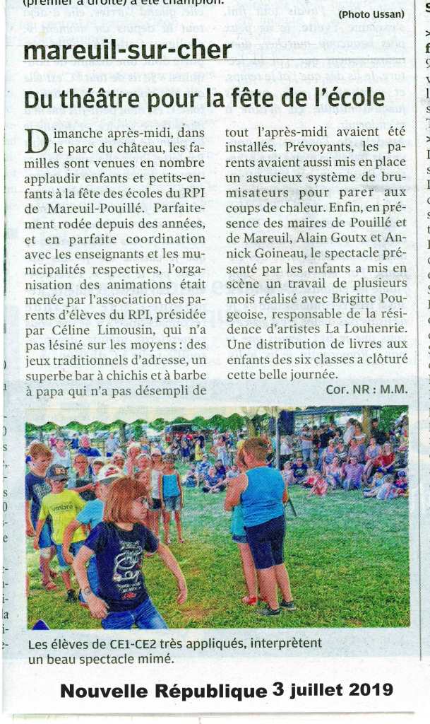 30 juin 2019 à 17H00 : au Château de Mareuil, présentation du travail de théâtre avec les 135 élèves des écoles de Pouillé et de Mareuil-sur-Cher.