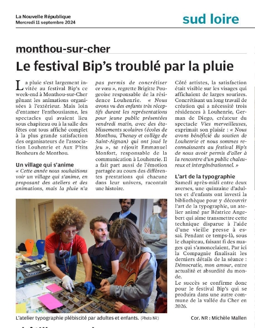 Commençons par la lecture avec le dernier article de presse de la Nouvelle République (Michèle MALLEN) daté du 11 septembre 2024 :